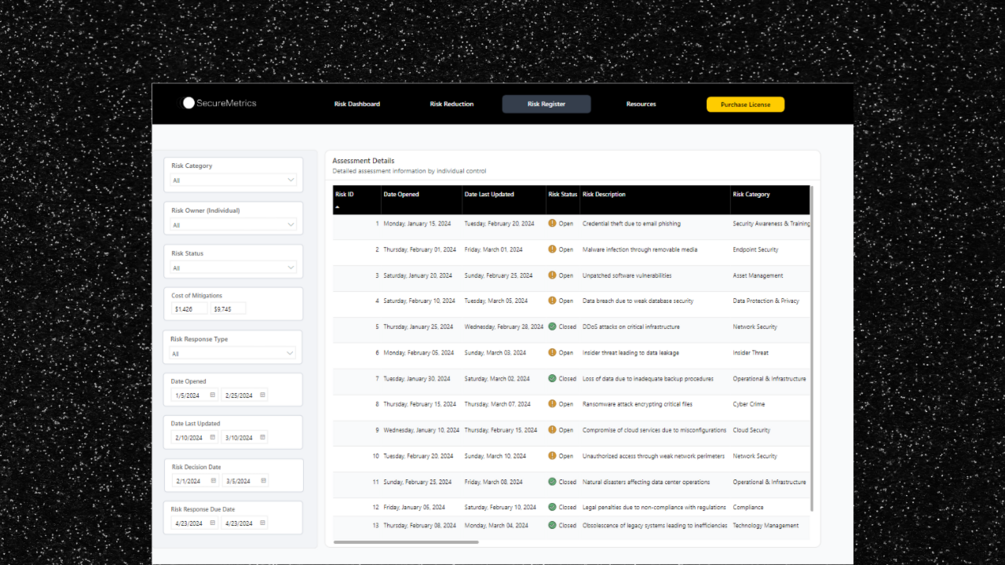 • Track dates such as opened, last updated, risk decision made, and risk response due